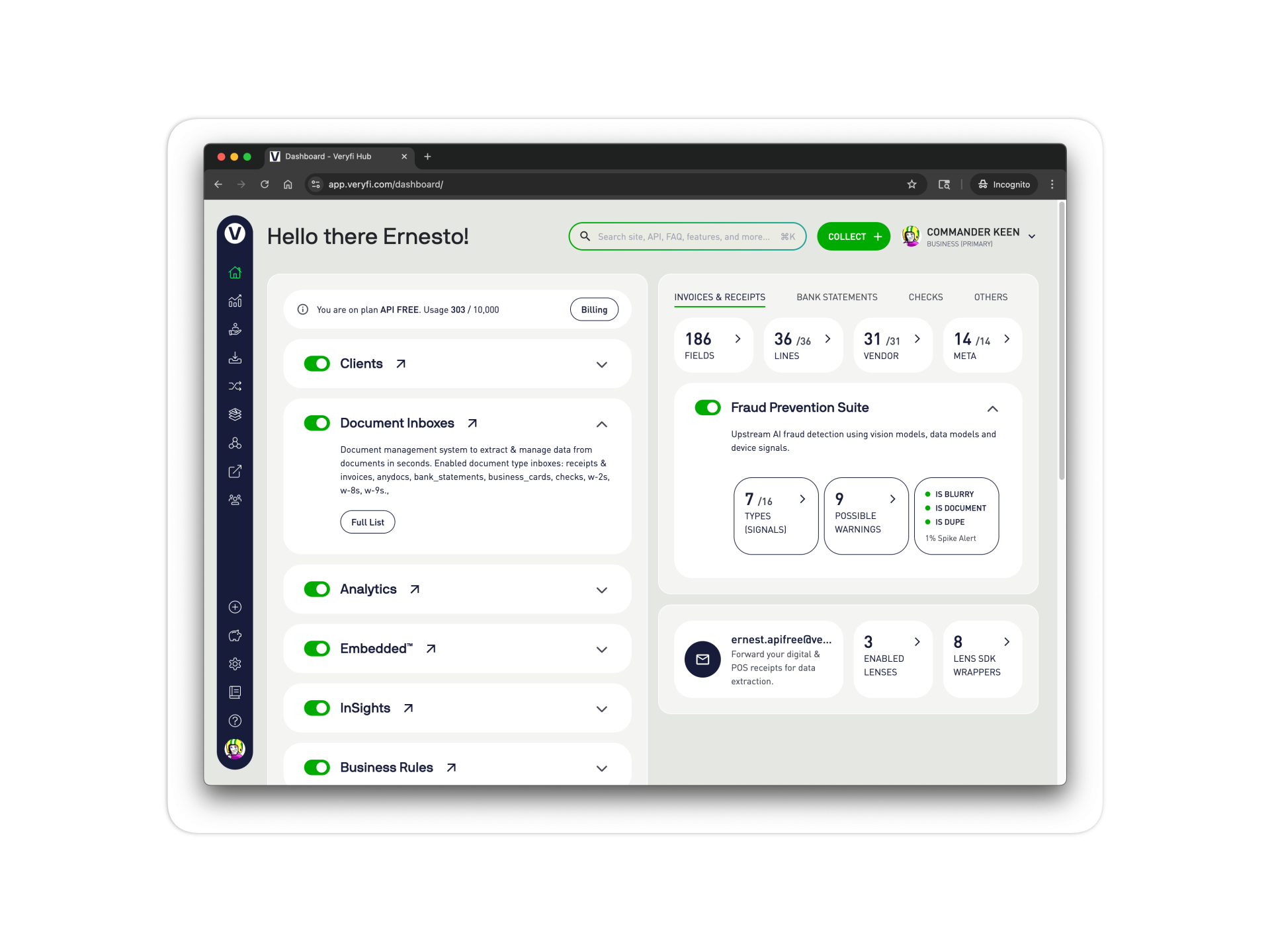 Veryfi API Hub is your all-in-one command center for every Veryfi service. From a single, no-code interface, you can access your API and Lens keys, manage documents, collaborate with your team, and explore everything Veryfi has to offer — all from the moment you sign up.