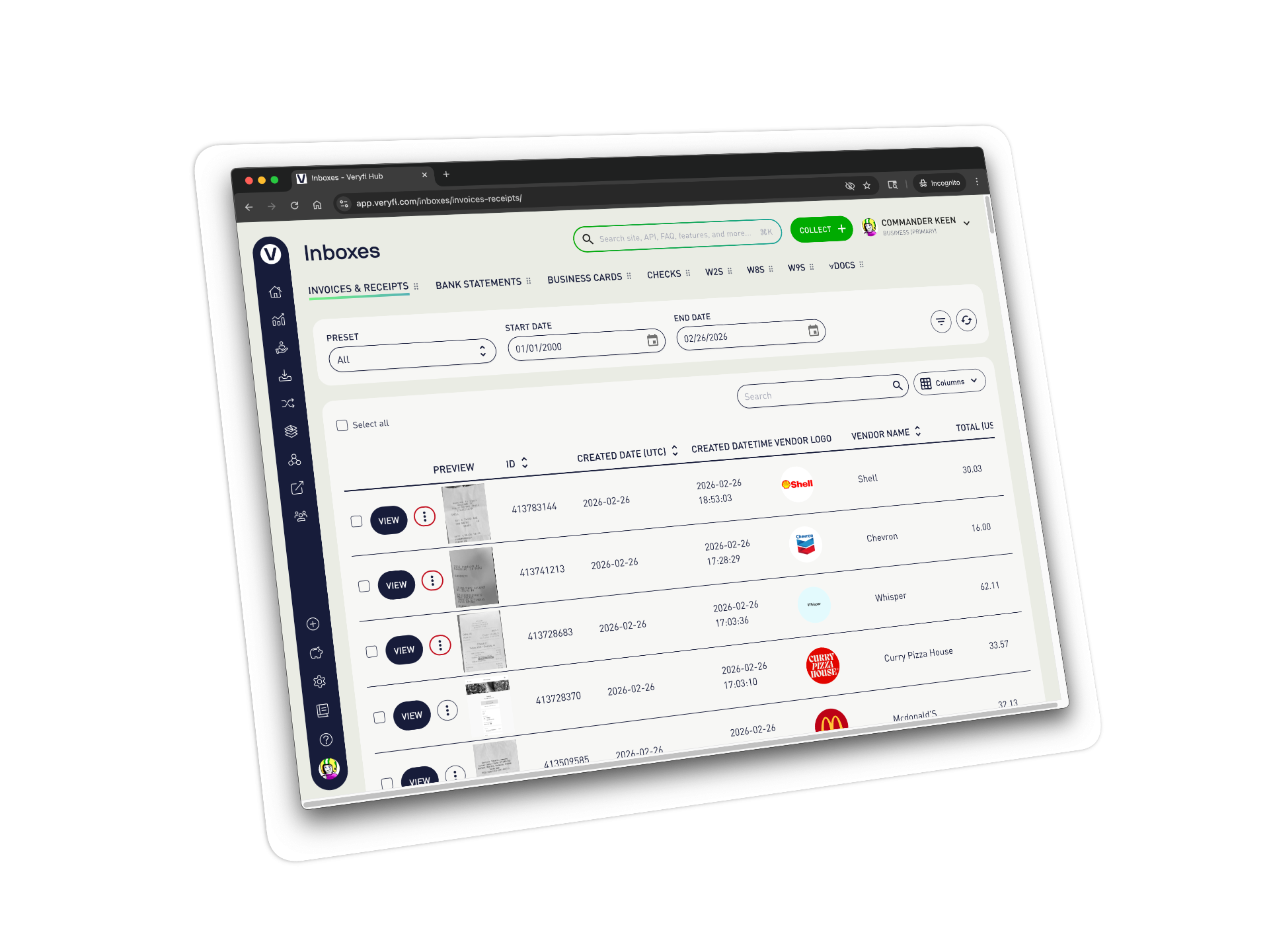 Your Inbox is where all your documents arrive and are available for viewing and managing. Whether you sent the document via Lens on Mobile, Email or use the API to upload a document for processing, THIS SPACE is where you will find it processed. This is your trusted unlimited storage space with Veryfi.