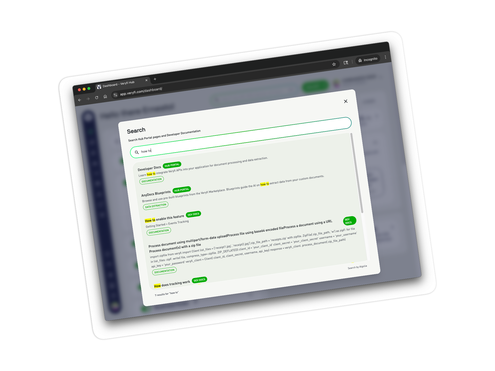 Every Veryfi account gets access to Veryfi API Hub. Veryfi API Hub is your central command center for all of Veryfi’s APIs, giving you everything you need in one place. From getting started and accessing your API keys to running no-code test drives and managing your processed documents, the Hub puts the full power of Veryfi’s capabilities right at your fingertips.