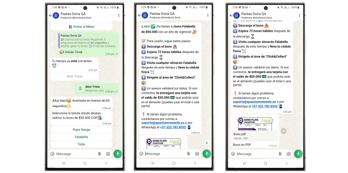 - Real-Time Rewards: If all answers were correct, the bot automatically generated a personalized PDF coupon worth COP $20,000.