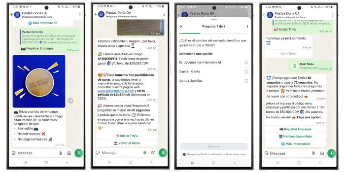 The mechanic was straightforward: buy a Doria lasagna, scan the hidden in-pack code, and instantly trigger a trivia challenge. Consumers had 60 seconds to answer three questions, one about the Doria brand, one about Disney’s Lilo & Stitch, and one that blended the two. Answer all correctly, and you’d win a COP $20,000 digital coupon, delivered instantly as a PDF, redeemable at Falabella, Totto, or Pepe Ganga.