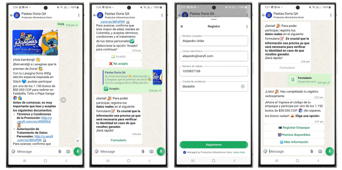 In May 2025, Veryfi partnered with Alimentos Doria (Pastas Doria), one of Colombia’s most iconic food brands, to launch Lasagnas que te premian, a promotion that gamified the simple act of buying pasta. Instead of relying on static codes or delayed prize fulfillment, the campaign delivered something fresh: scan, play, and win, all in real time, on WhatsApp.