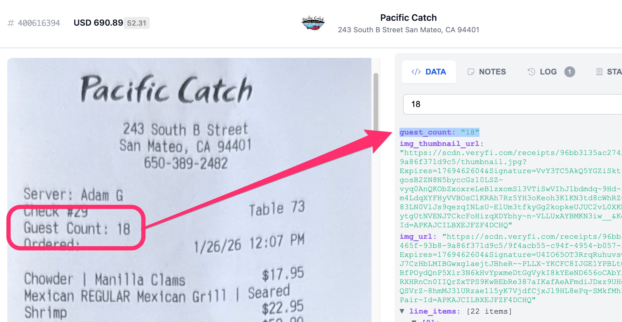 Veryfi Receipts OCR API automatically extracts the guest count directly from the receipt itself — no manual input required. When a restaurant prints the number of covers or guests on the check (as shown above with “Guest Count: 18”), Veryfi captures this as a structured guest_count field in the API response.